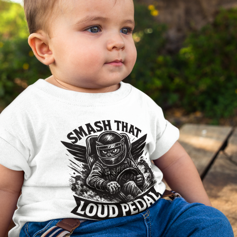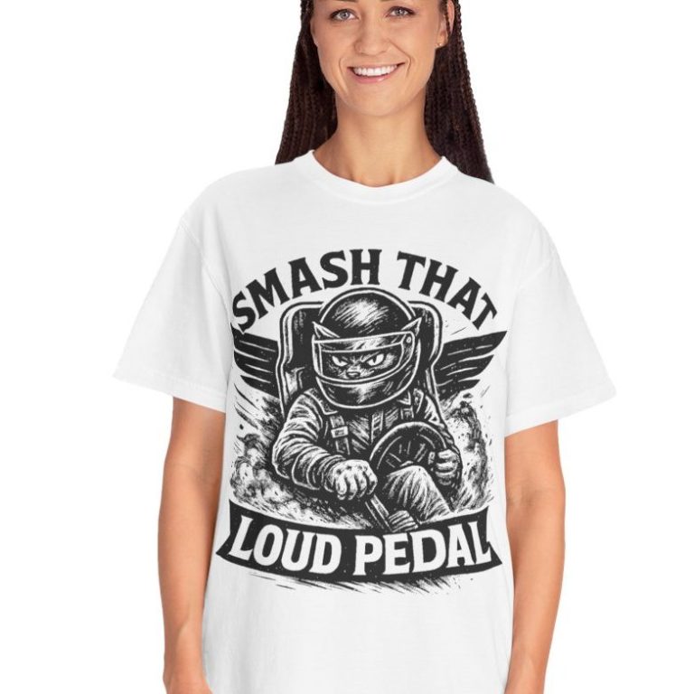For racers who love kitties with horsepower. This tee features a wild cat ripping a racing mower with the slogan “Smash That Loud Pedal.” Fun, bold, and perfect for track days or casual wear.